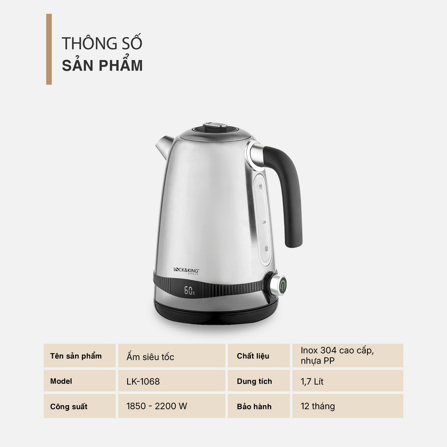 Sở hữu phong cách thiết kế tối giản nhưng vẫn toát lên sự tinh tế, ấm siêu tốc LK-1068 là lựa chọn phù hợp cho những ai ưu tiên không gian bếp gọn gàng và tiện dụng. Sản phẩm không chỉ đẹp mắt mà còn dễ dàng hòa hợp với nhiều phong cách nội thất hiện đại.