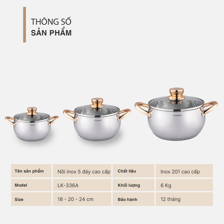 Bảo hành: 12 ThángLấy cảm hứng từ những căn bếp Hàn Quốc thanh lịch, nơi việc nấu ăn được chăm chút như một nghệ thuật, Bộ Nồi Inox 5 đáy Cao Cấp Lock&King LK-336A được tạo nên với tinh thần đề cao cái đẹp và sự chỉn chu. Sản phẩm mang đến cảm giác tinh tế ngay từ thiết kế, góp phần làm nổi bật không gian bếp hiện đại.