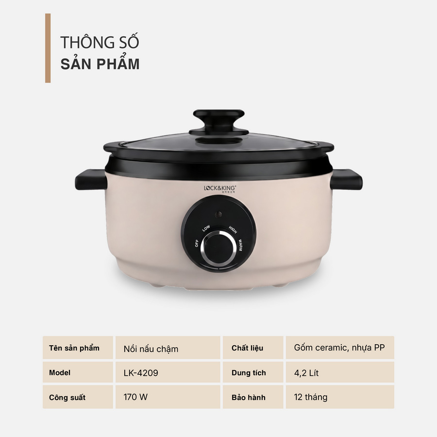 Nồi nấu chậm LK-4209 được thiết kế theo phong cách tối giản đặc trưng của Hàn Quốc, mang lại vẻ đẹp tinh tế cho không gian bếp. Không chỉ phục vụ nhu cầu nấu nướng, sản phẩm còn góp phần nâng cao tính thẩm mỹ, tạo nên một không gian sống hiện đại và hài hòa.