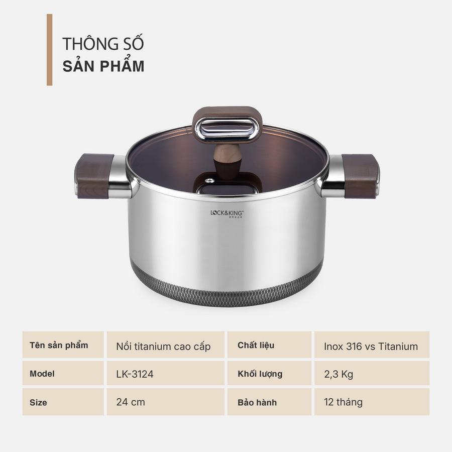 Nồi Titanium cao cấp LK-3124 được thiết kế theo phong cách hiện đại, tinh giản đặc trưng của Hàn Quốc. Không chỉ hỗ trợ việc nấu nướng hằng ngày, sản phẩm còn góp phần mang lại vẻ đẹp sang trọng và hài hòa cho không gian bếp gia đình.