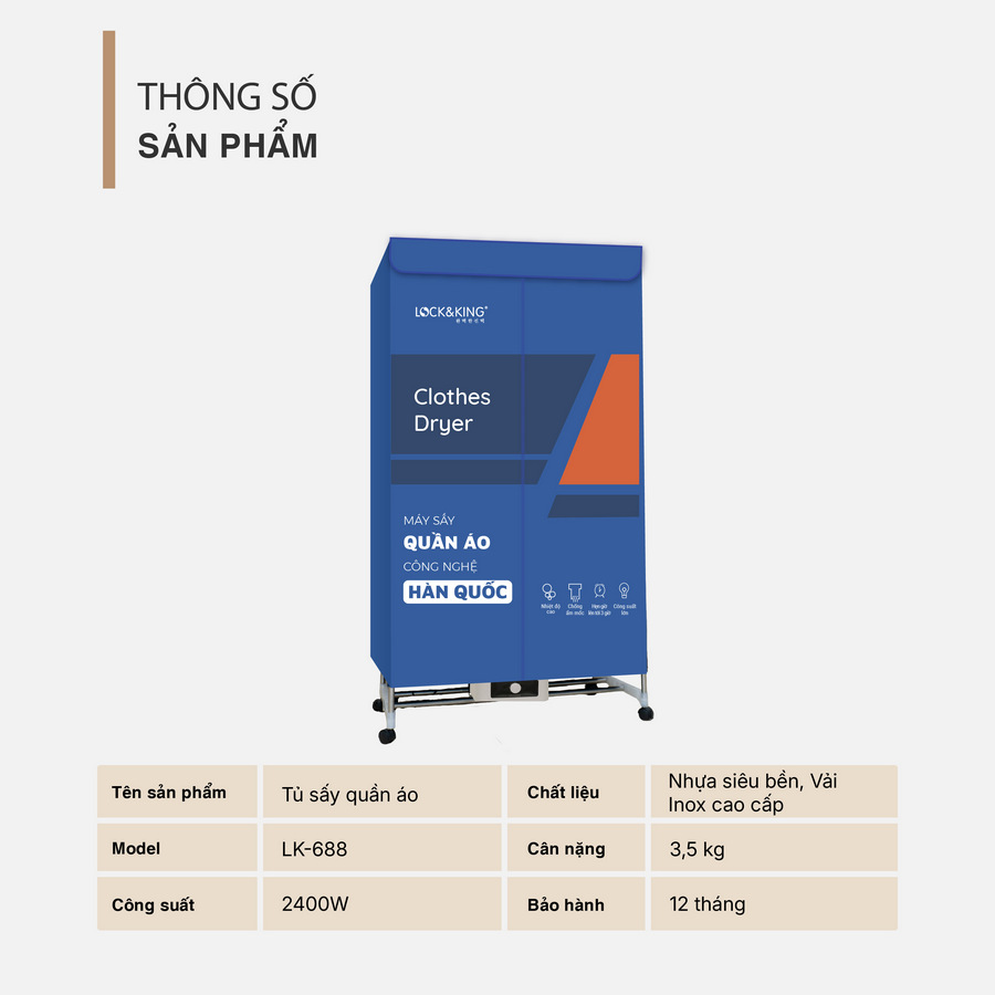 Được khơi nguồn từ triết lý sống tinh gọn và hiệu quả, tủ sấy quần áo Lock&King LK-688 là sự hòa quyện hoàn hảo giữa công nghệ và thẩm mỹ. Không chỉ giúp quần áo luôn khô ráo, sản phẩm còn góp phần tạo nên không gian sống gọn gàng, thanh lịch và đầy cảm hứng.